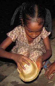 I was getting settled in when I looked up and saw a beautiful little girl running toward us. She had something in her hands and a determined expression on her face and I knew that she had found in me an obvious sucker who would buy her wares even if she had been selling baby cobras.